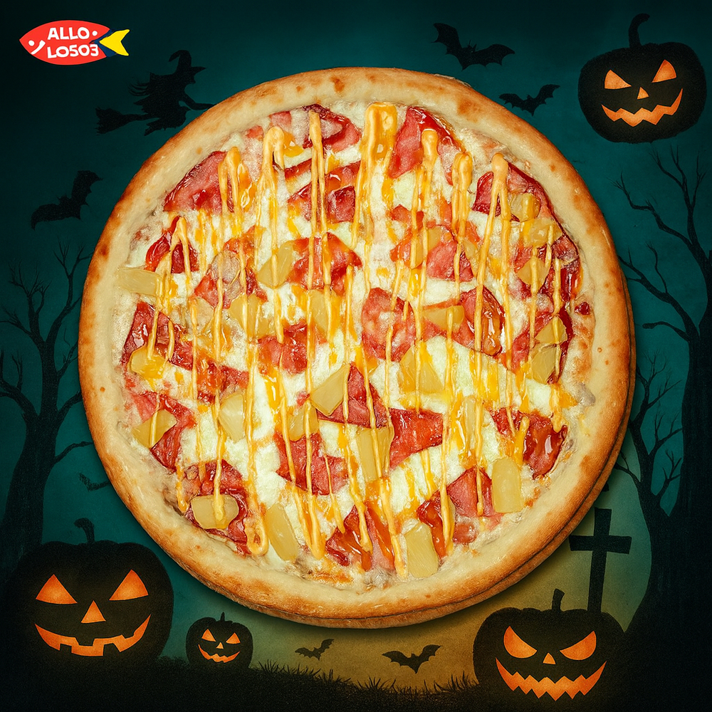 Куряча грудка маринована, Шинка, сир "Моцарелла", Ананас, Вершкова основа, соус "Спайсі", Манговий соус, часник. Бортики змащуються часниковим маслом.