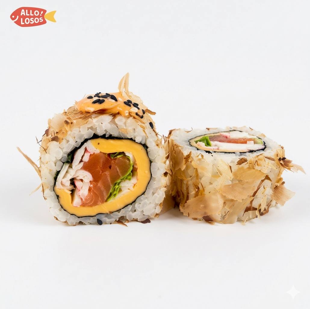 Рис, норі, Лосось слабосолений, краб, сир "Чедер", салат "Лолло Бьонда", стружка тунця, соус "Спайс" кунжут, 8 шт
