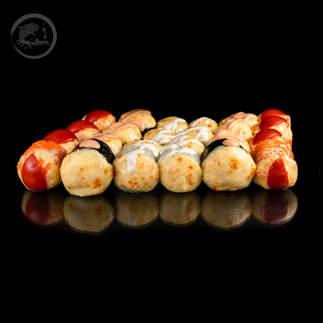 Рис, норі, сир «Філадельфія», сир «Пармезан», томат "Черрі", креветка, ікра летючої риби (колір може відрізнятися), майонез, 8 шт.