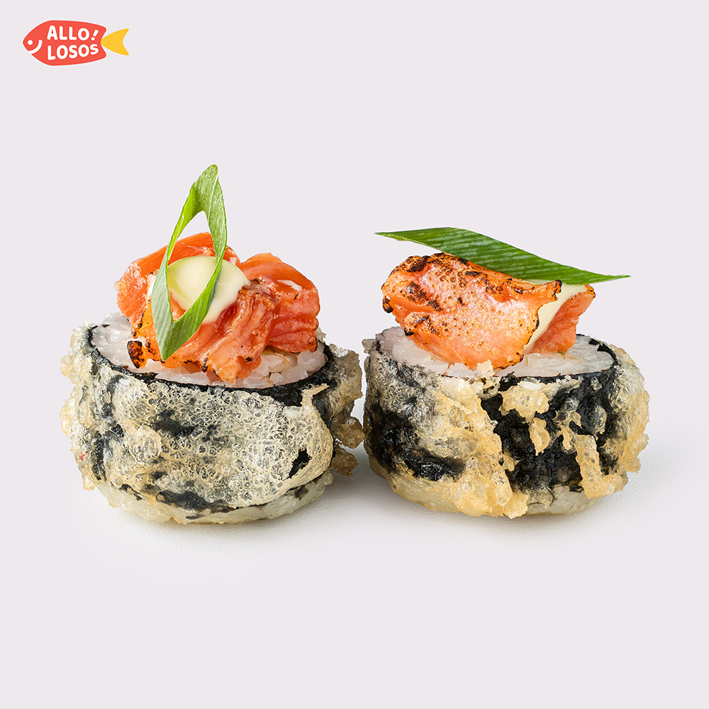 Рис, водорості норі, слабосолона лосось, сир "Креметта", авокадо, майонез, цибуля зелена, темпура, 8шт.