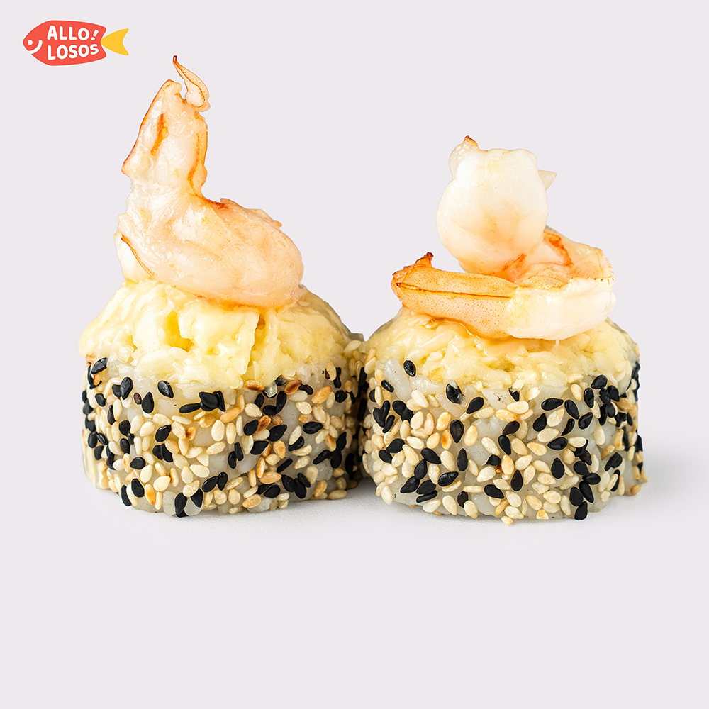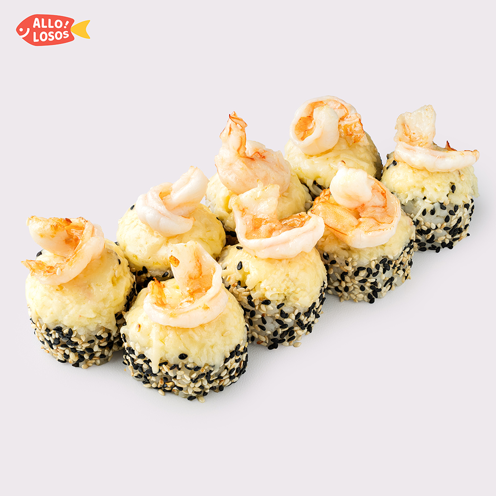 Рис, водорості норі, слабосолона лосось, тунець, тигрова креветка, авокадо, сир "Кремета", сир "Пармезан", майонез, кунжут білий, 8шт.
