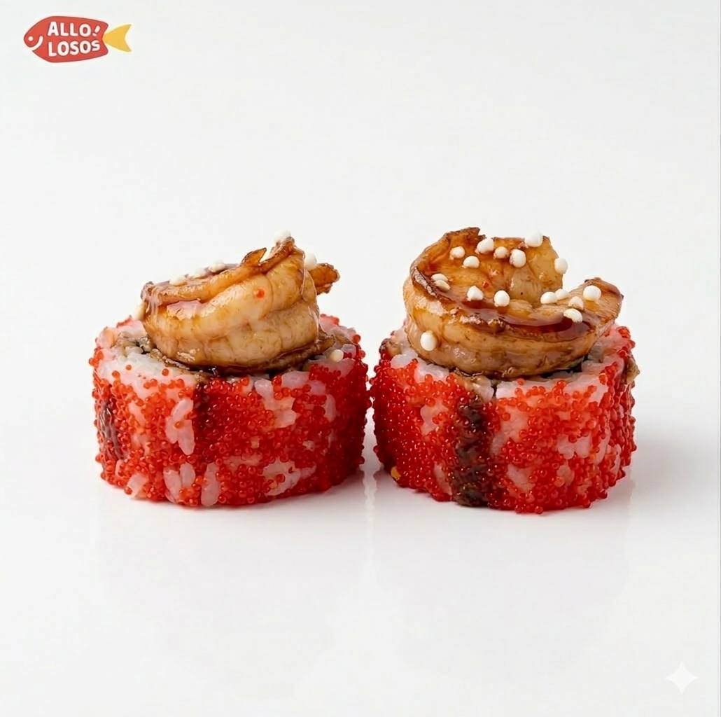 Рис, нори, Тигровая креветка, краб, творог "Кремета", огурец, Масаго, соус "Унаги", соус "Спайс", 8 шт