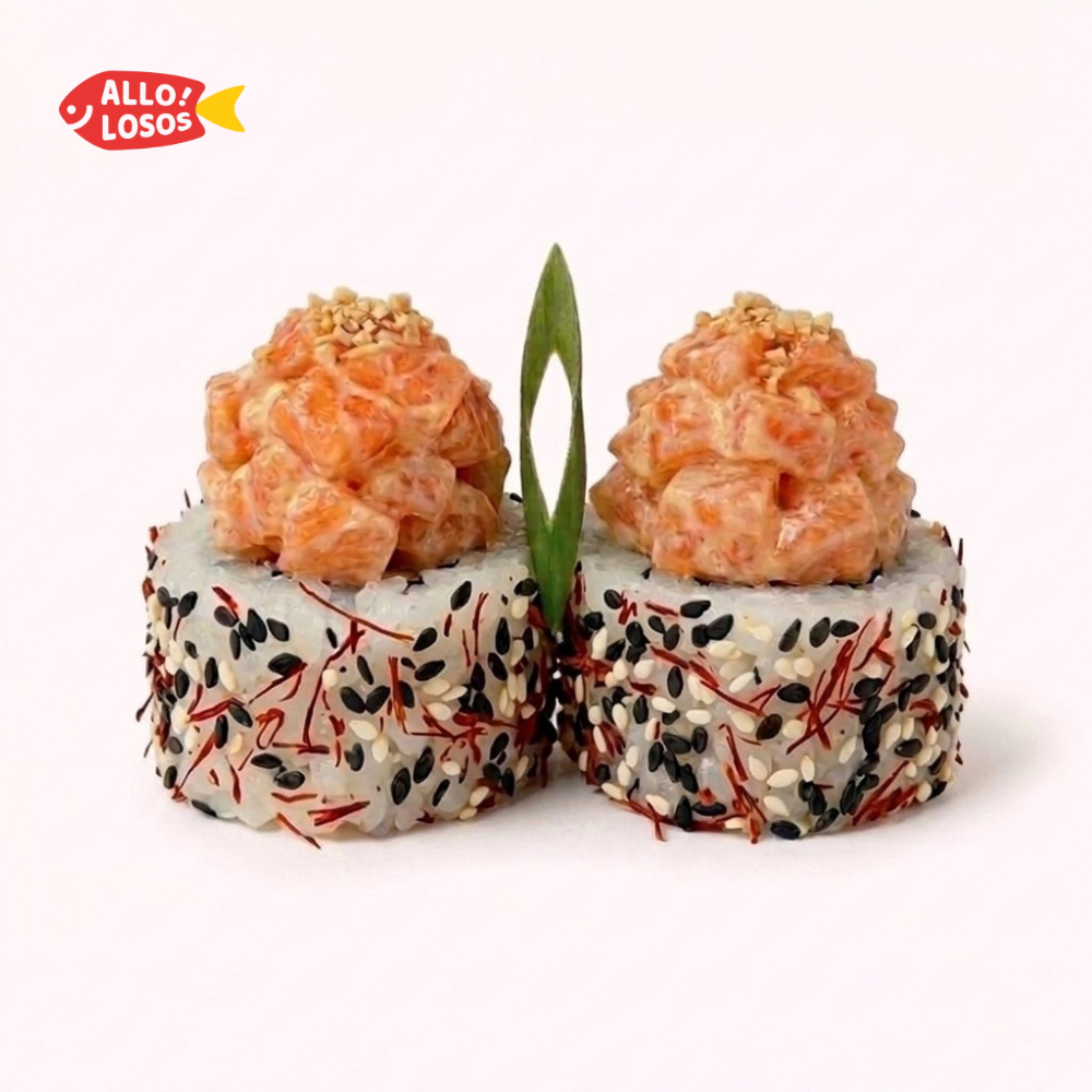 Рис, нори, Лосось слабосоленый, сыр "Кремета", огурец, яблоко, майонез, лук зеленый, арахис, 8 шт