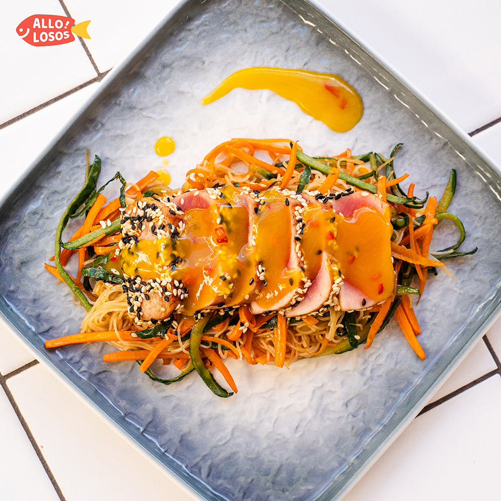 Легкое блюдо, дающее ощущение свежести и энергии. Нежное филе тунца в кунжуте слегка обжаренное до состояния "medium rare" подается с овощной лапшой и ярким соусом манго-чили. Это не просто еда – это баланс вкуса, пользы и эстетики. ???? Без тяжести, без лишнего жира – только польза и удовольствие.